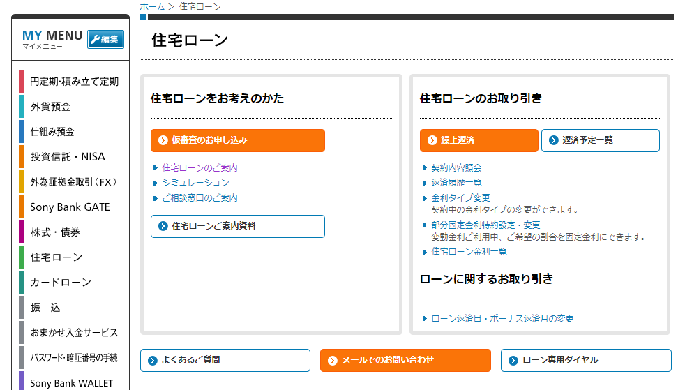 住宅ローンの借り換えをしたときの話を書いた時に、思い切ってソニー銀行の担当ローンアドバイザーさんにメールで問い合わせしてみたところ、ネットで簡単に手続きができ、手数料についても確認できるらしい。