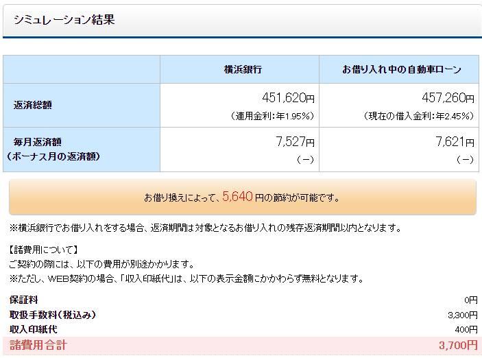 横浜銀行マイカーローンお借り換えシミュレーションの結果