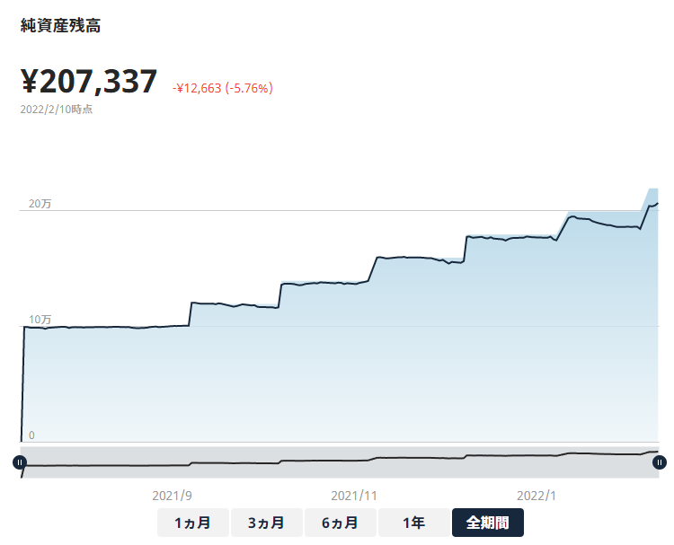 21年7月からSUSTENをはじめて、9月から2万円ずつ積立投資を続けている。