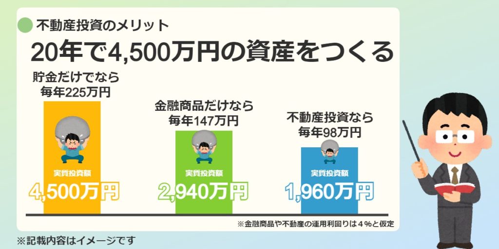 20年間で金融資産4,500万円にするために、預貯金、金融商品、不動産の3つで比較。