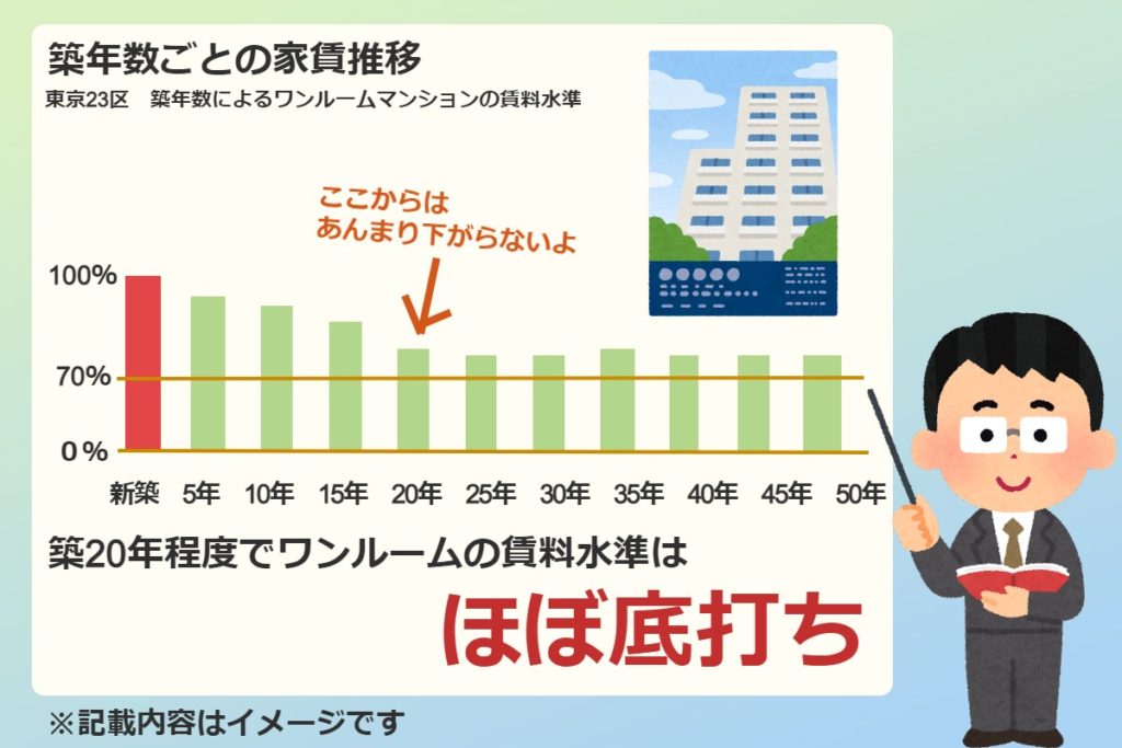 特に都内のワンルームマンションでは、築20年くらいで賃料はほぼ底打ち状態になり、それ以下にはなりにくい傾向。