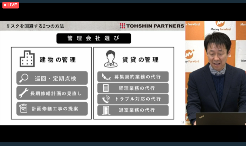 管理会社もちゃんとしたところを選ばないと、、、というお話もあったけど、トーシンパートナーズみたいな会社経由で契約するなら、管理会社選びというよりも、管理サービス選びという観点で見た方がいいかも。